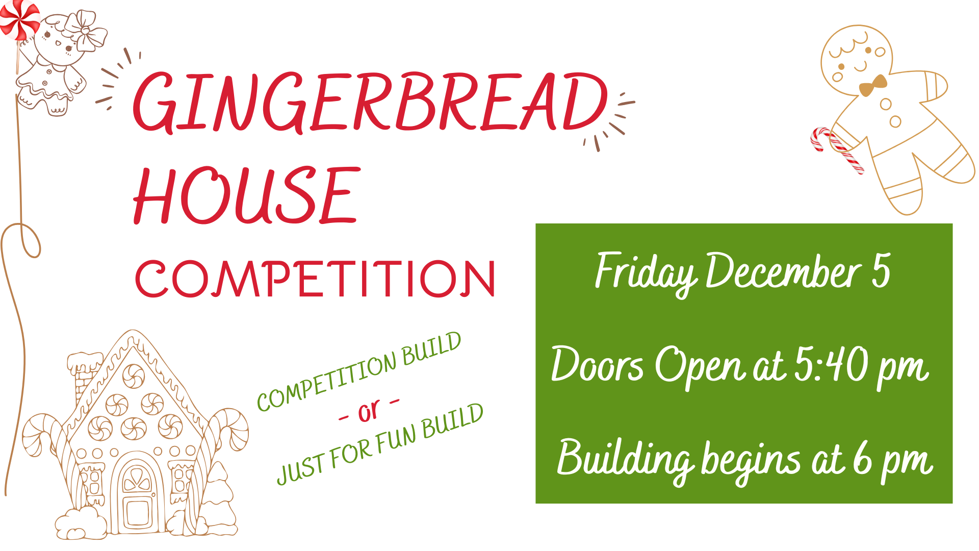 Families with kids through age 18 - be sure to save the date for our annual Gingerbread House Competition on Friday, December 5th at 6:00 pm!